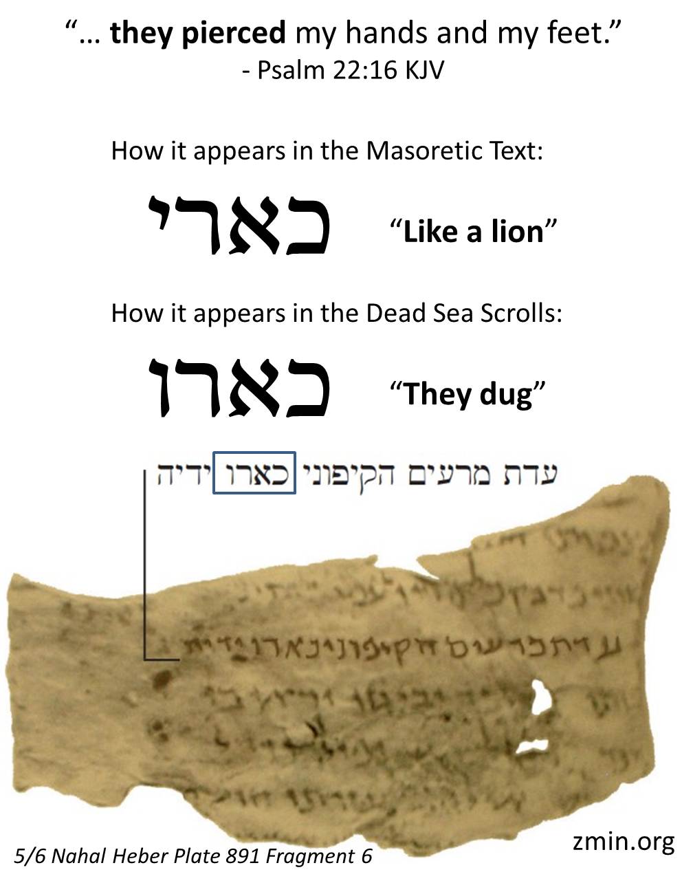 The witness of the Septuagint is further supported by the witness of the Dead Sea Scrolls. In a fragment containing Psalm 22 from the first century BCE, the word written as כארי (“like a lion”) in the Masoretic Text is written as כארו (“they dug”), which is a form of the verb כרה, “to dig”.