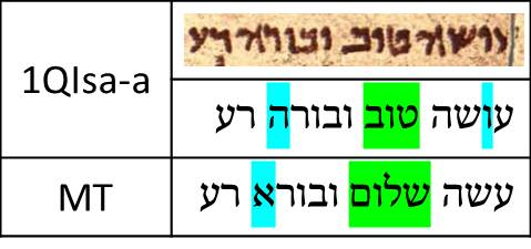Probably one of the most interesting textual variants between the MT and 1QIsa-a is at Isaiah 45:7: