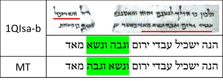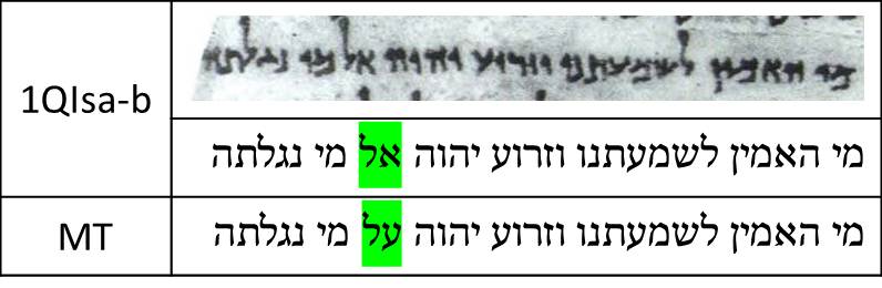 Again, there are no spelling variants between 1QIsa-b and the MT at Isaiah 53:1. However, both manuscripts disagree regarding which preposition to use. While the Masoretic Text uses על “upon; because of”, 1QIsa-b uses אל “to” (just like 1QIsa-a).